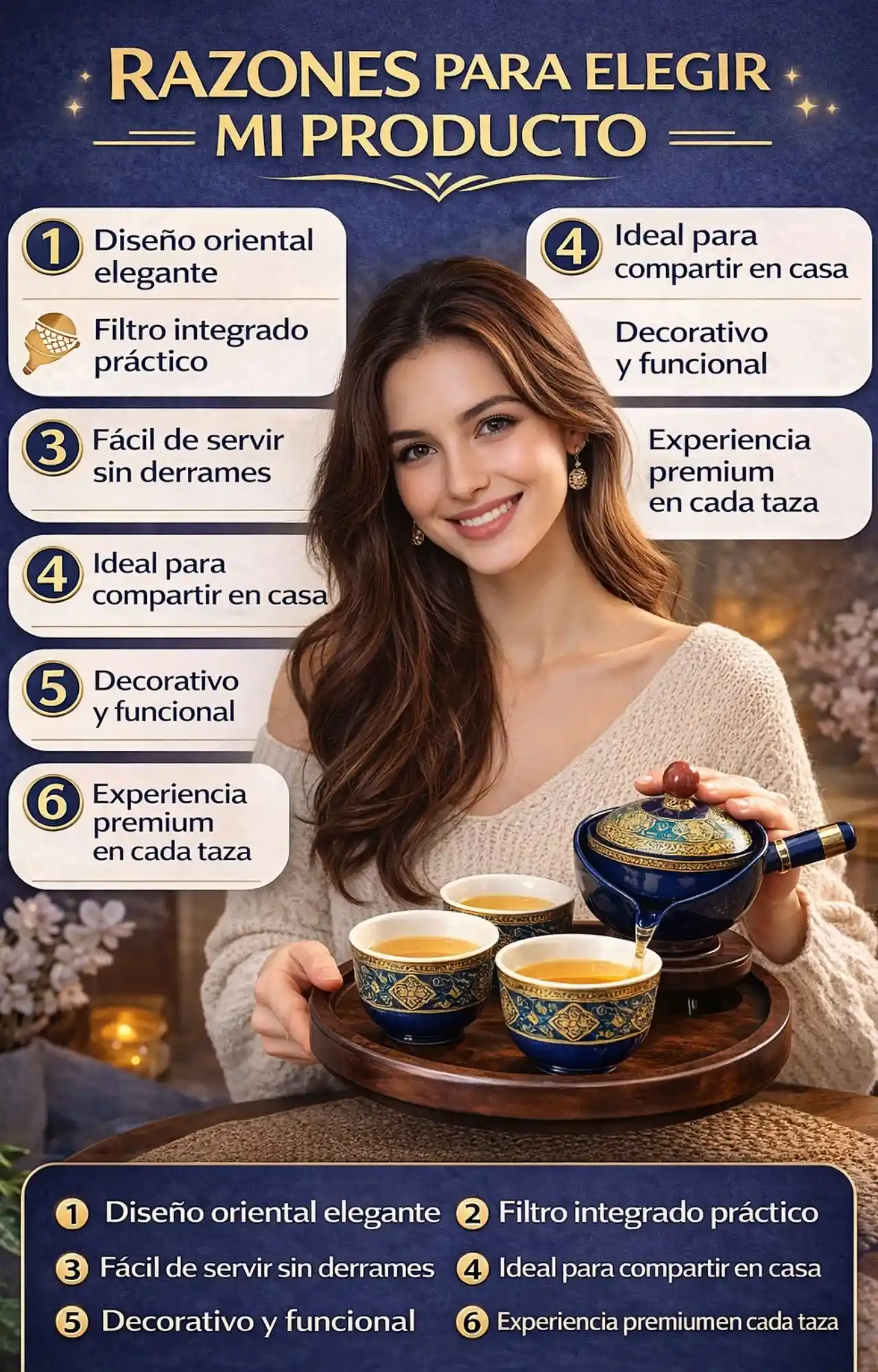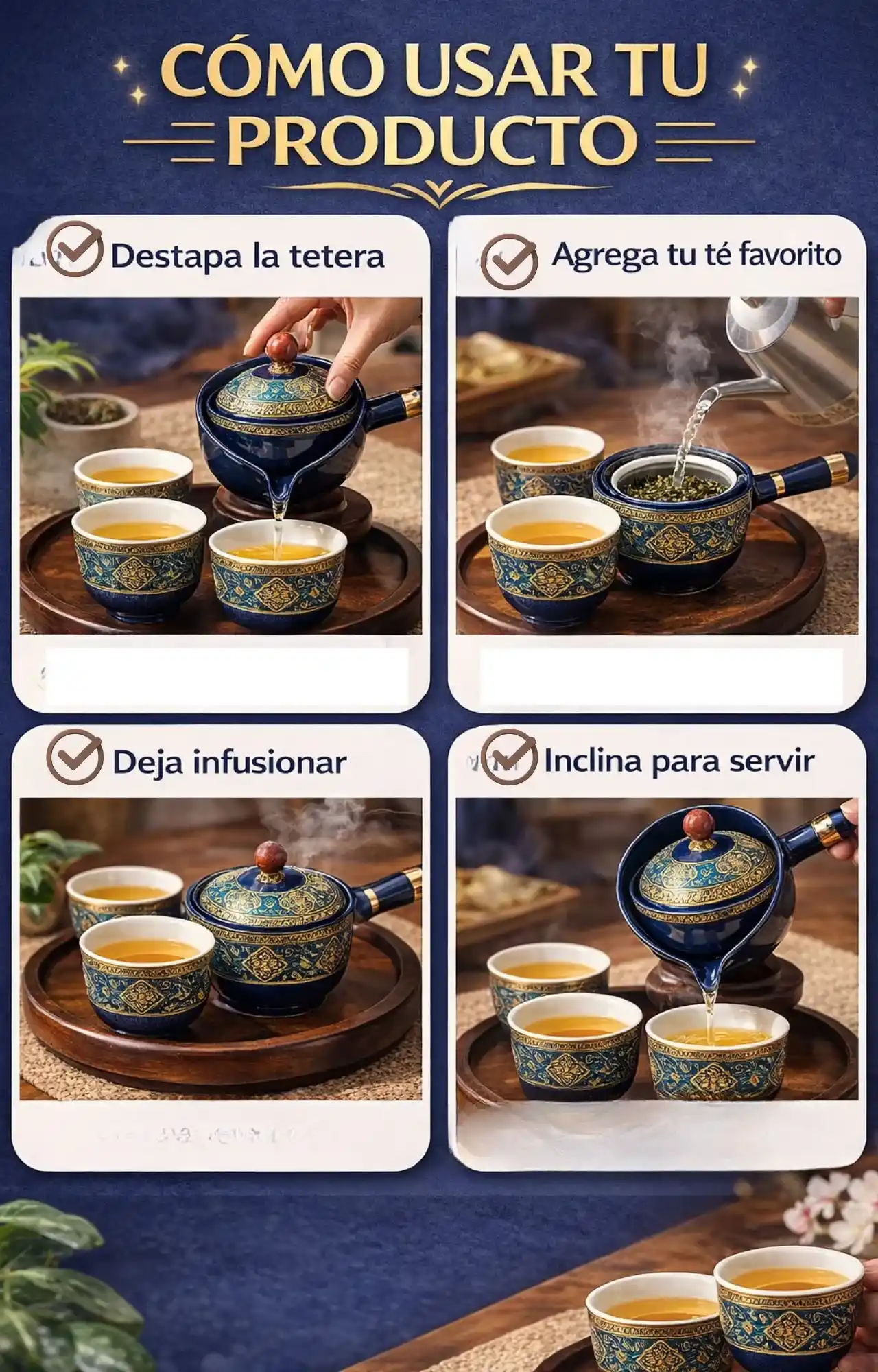 Incluye la tetera con filtro integrado, las tazas a juego y la bandeja, según el diseño seleccionado.